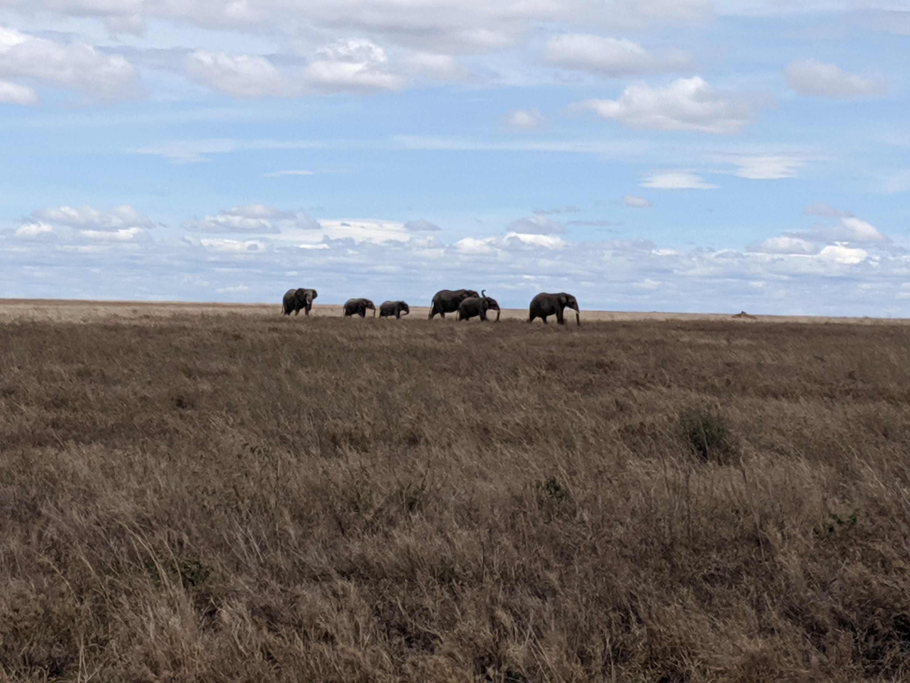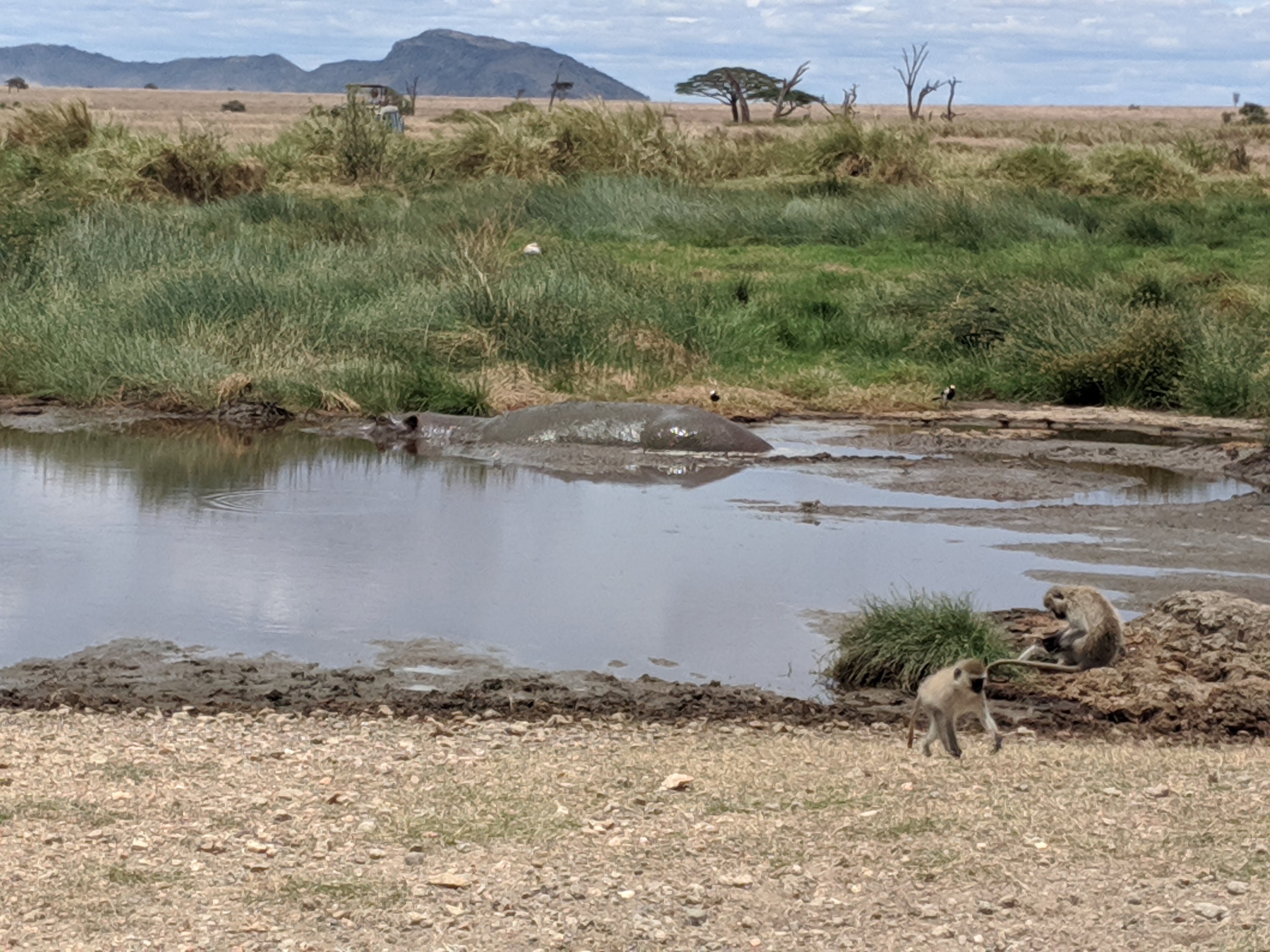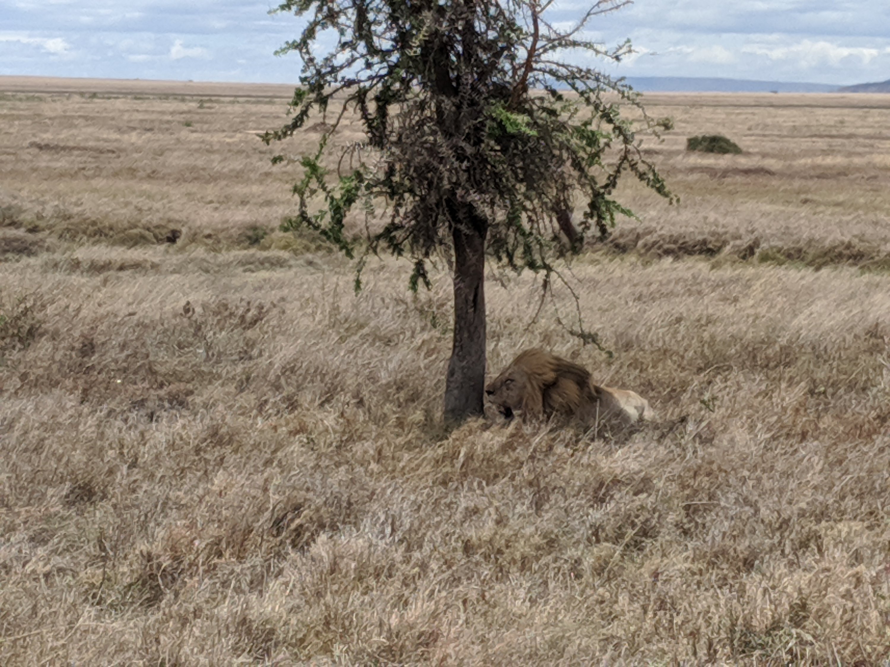 Today we started our safaris in the Serengeti. We got to sleep in, till 6, woohoo, and then started our game drive at 7:30. Serengeti means open plains which is very much evident. Slowly undulating plains sparsely filled with trees and shrubs dominate this landscape. Right off the bat we saw some Cape Buffalo running and found two lions cuddling in the bush. There was a female and a male, a rare sighting to see them that closer together. After that we ran across a juvenile male lion hanging out on top of a termite mound making the local Impala and warthogs nervous. We then came across a bull elephant who wasn’t terribly happy with us and charged. That was exciting/scary/amazing! Throughout the day we saw lone hyena males, looking so cute, many many Giraffe, all giving us the stink eye, gazelles of various types in the thousands, birds like crazy, vervet monkeys, baboons, zebra, mongoose, 30 or 40 hippos sleeping in a giant mud puddle together, jackals and of course the cats. We saw 13 lions in various stages of napping. Nine of them had just killed a zebra and were in a food coma. One leopard we watched cross the plain and then climb a tree. And the coolest was a cheetah that had just killed an Impala. It was feasting as fast as it could while also keeping a lookout for other predators. Lions, leopards, and hyenas will steal a cheetah’s food but a cheetah will only eat what it had just killed. All in all, a spectacular day, we really loved it. Tomorrow we’re going to drive to the other side of the Serengeti in the hopes of seeing the great migration. We hadn’t planned on seeing it here but because of climate change it had come earlier and from a different direction. Finishing our day, we sit reading on our porch, watching the baboons, Impala, and giraffe go by.