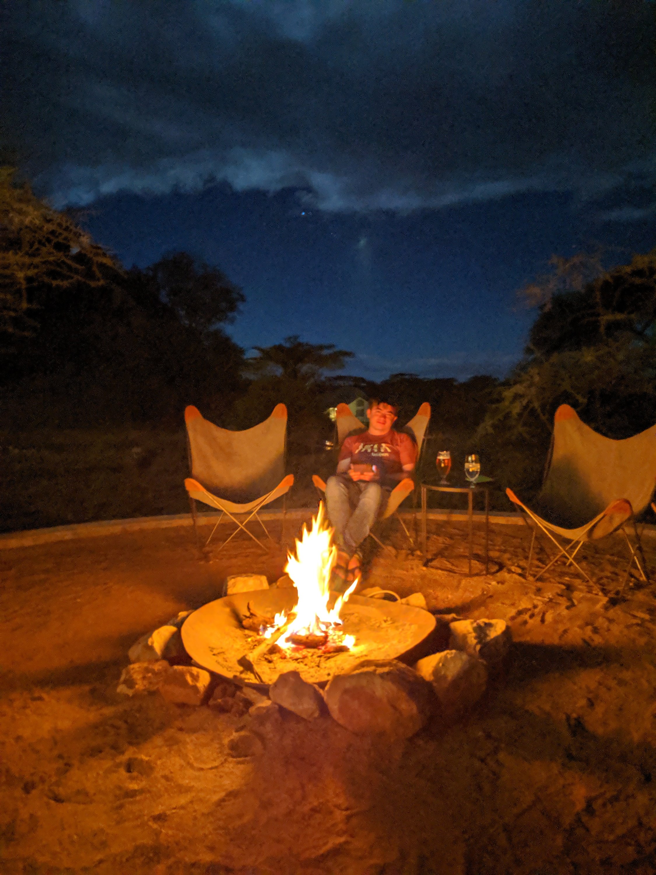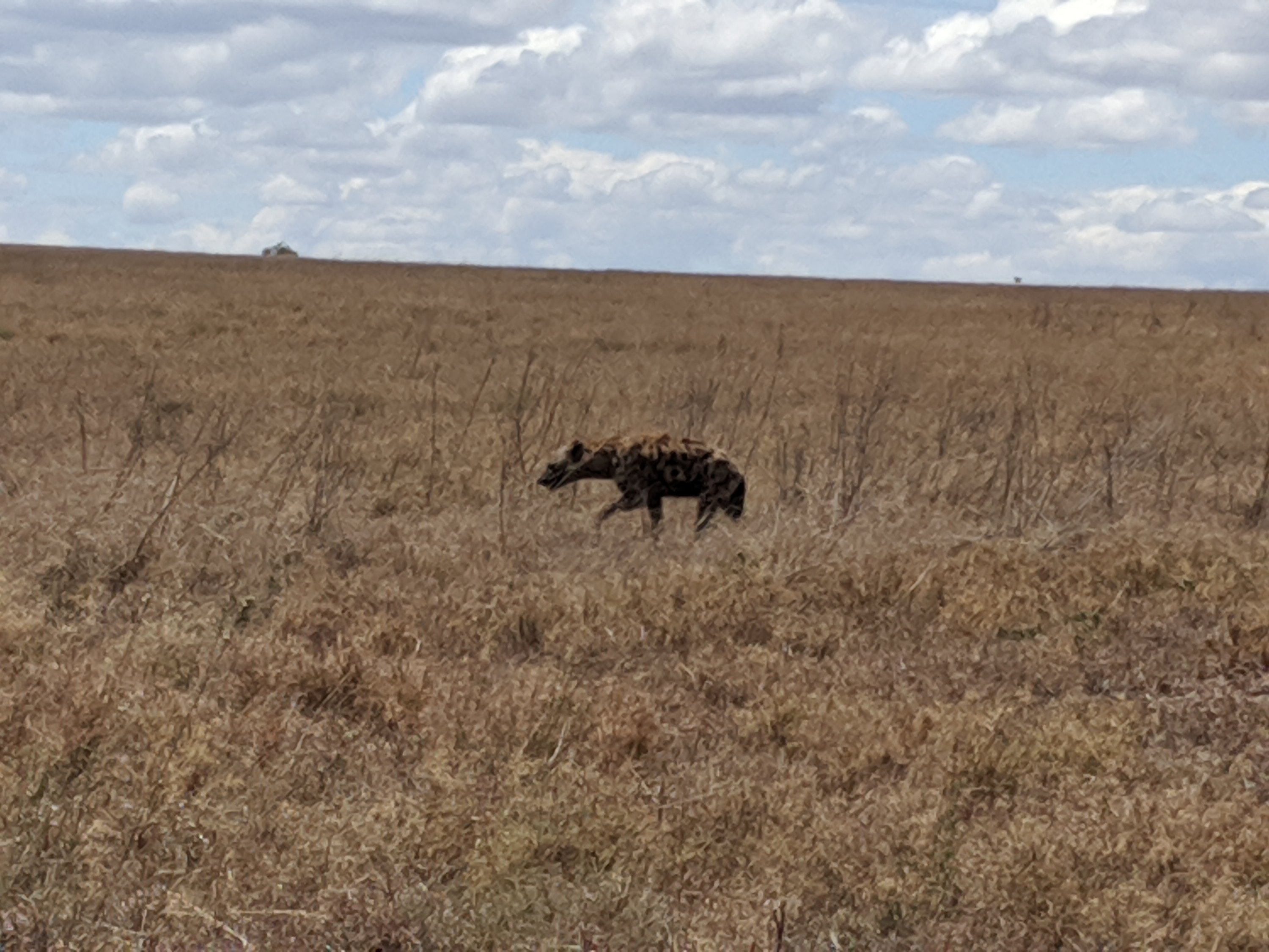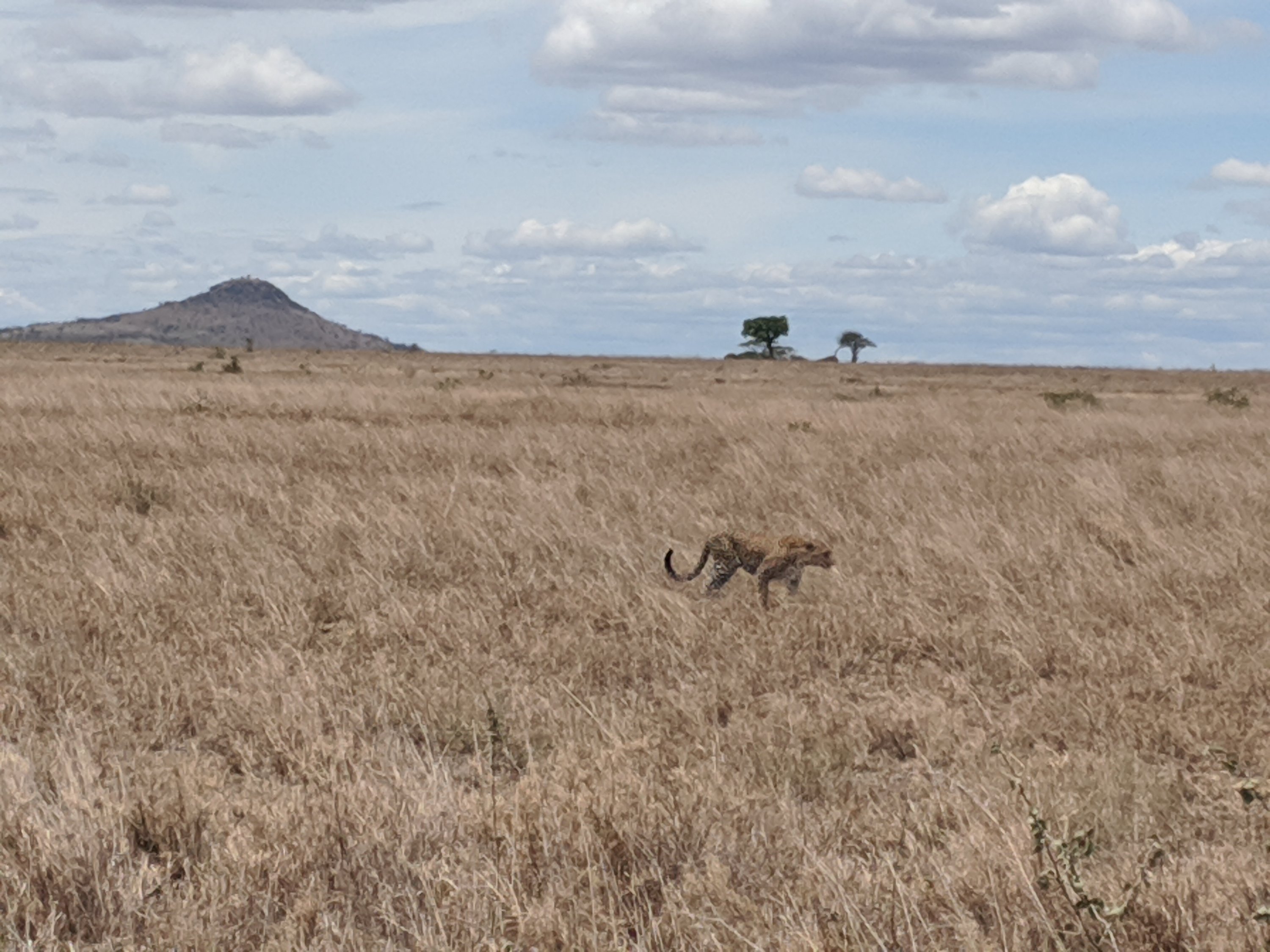 Today we started our safaris in the Serengeti. We got to sleep in, till 6, woohoo, and then started our game drive at 7:30. Serengeti means open plains which is very much evident. Slowly undulating plains sparsely filled with trees and shrubs dominate this landscape. Right off the bat we saw some Cape Buffalo running and found two lions cuddling in the bush. There was a female and a male, a rare sighting to see them that closer together. After that we ran across a juvenile male lion hanging out on top of a termite mound making the local Impala and warthogs nervous. We then came across a bull elephant who wasn’t terribly happy with us and charged. That was exciting/scary/amazing! Throughout the day we saw lone hyena males, looking so cute, many many Giraffe, all giving us the stink eye, gazelles of various types in the thousands, birds like crazy, vervet monkeys, baboons, zebra, mongoose, 30 or 40 hippos sleeping in a giant mud puddle together, jackals and of course the cats. We saw 13 lions in various stages of napping. Nine of them had just killed a zebra and were in a food coma. One leopard we watched cross the plain and then climb a tree. And the coolest was a cheetah that had just killed an Impala. It was feasting as fast as it could while also keeping a lookout for other predators. Lions, leopards, and hyenas will steal a cheetah’s food but a cheetah will only eat what it had just killed. All in all, a spectacular day, we really loved it. Tomorrow we’re going to drive to the other side of the Serengeti in the hopes of seeing the great migration. We hadn’t planned on seeing it here but because of climate change it had come earlier and from a different direction. Finishing our day, we sit reading on our porch, watching the baboons, Impala, and giraffe go by.