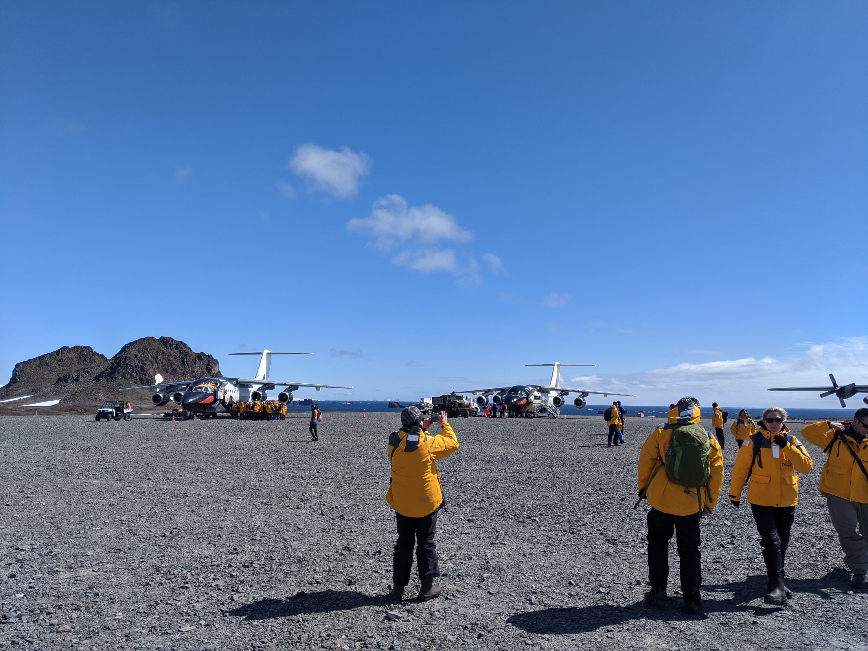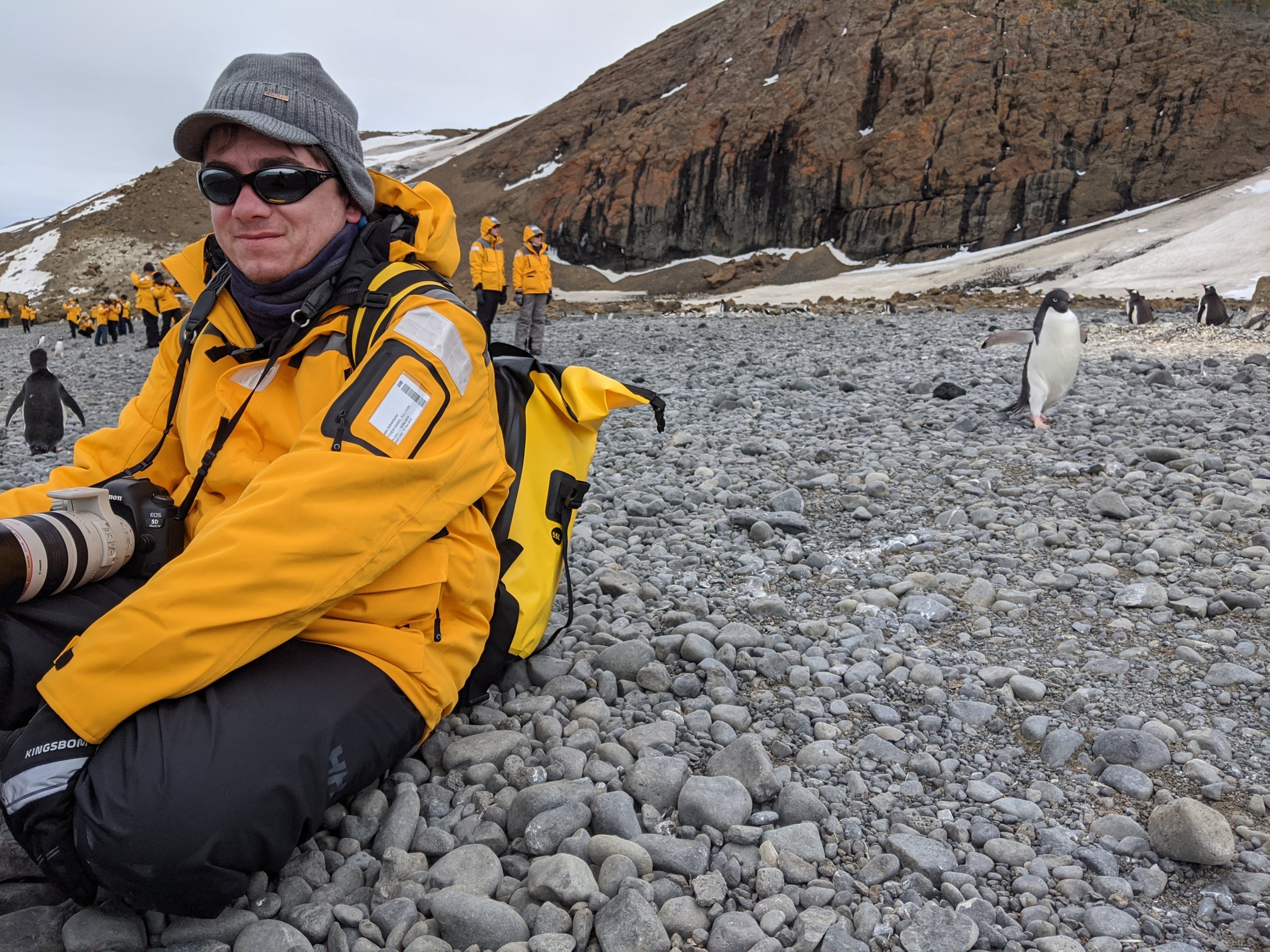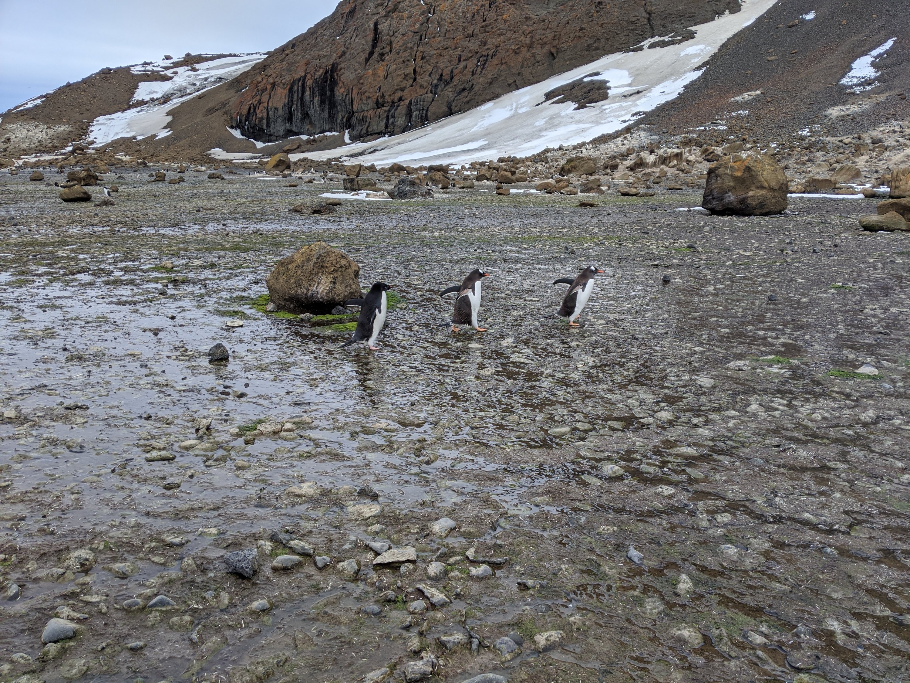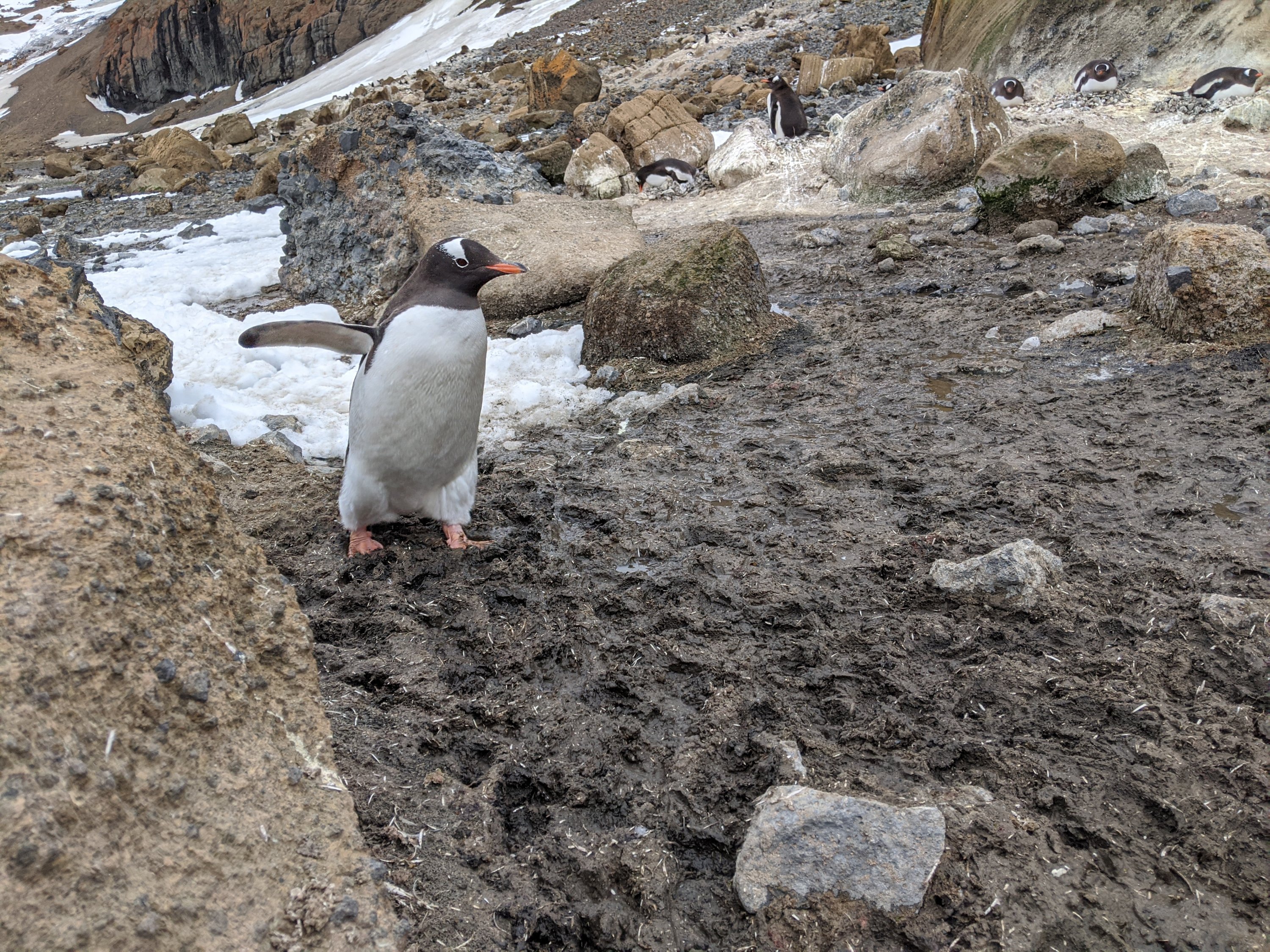 We started the morning before everyone else with a panicked visit to the gift shop, our waterproof pants were decidedly not. After, sigh of relief, getting a pair each we went out on our first zodiac excursion to Kinne’s Cove. We motored around lots of floating sea ice. Depending on what I’m not sure, but some pieces would glow softly blue, it was surreal. Then we went to a small rocky island and saw our first up close penguins. There were many Adelie penguins and a singular Gentoo penguin. The Adelie are adorable with a black beak and a white ring around their eyes. The Gentoos have an orange beak with white splotches on their head, they also are a little bigger. We enjoyed penguin antics for awhile, amazing! They have such personality! It was fun watching them get into groups anxiously trying to get up the nerve to go in the ocean, where the leopard seals lurk. Once the first one went, it became an avalanche of penguins. We returned to the ship for a lunch and a warm up, then it was off to the continent. Brown Bluff was where we landed next by zodiac, on the Antarctica continent. The cliffs we’re formed by underwater volcanos giving it it’s brown color as well as continental plate dynamics. From there we could walk to the South Pole if we wanted to and had the dumb luck of the early pioneers, well at least until Darwin won. There were giant cliffs and a small Gentoo breeding colony. A few had chicks just days old and they would sit on them, completely covering them and protecting them from the cold. Walking down the beach, we then saw the Adelie colony, it was huge. Or so we thought, then we looked farther, and farther, and farther, it just kept going! Tens of thousands of penguins, so so many! We started by sitting on the beach by some penguins. We stayed very still and got rewarded with a walk by! We did this a few times and got quite a few curious penguins wondering why there were giant neon yellow blobs on their beach. We then explored the edge of the colony and the Adelie had hatched their young earlier so we saw many a dark gray youngster. They lay two eggs and if lucky, both make it to fledgling without being eating by a Skua, a predator bird. The little ones were adorable, fluffy and needy, mom or dad feeding them when they finally got loud enough. After that we went on a zodiac excursion, morning around icebergs and watching penguin antics on them. They are so funny when walking on ice, slipping and sliding. It was just so fun to watch, we really loved it. That night we came back and found out because of heavy ice, we would not be making it below the Antarctica circle but instead would be going to the east side of the Antarctica peninsula for a few days, a rare treat. We then hung out with our new best friends and watched the most glorious sunset of my life, it lasted 3 hours, the landscape painted in oranges and pinks with the ever present glowing blue ice bergs. Words cannot describe