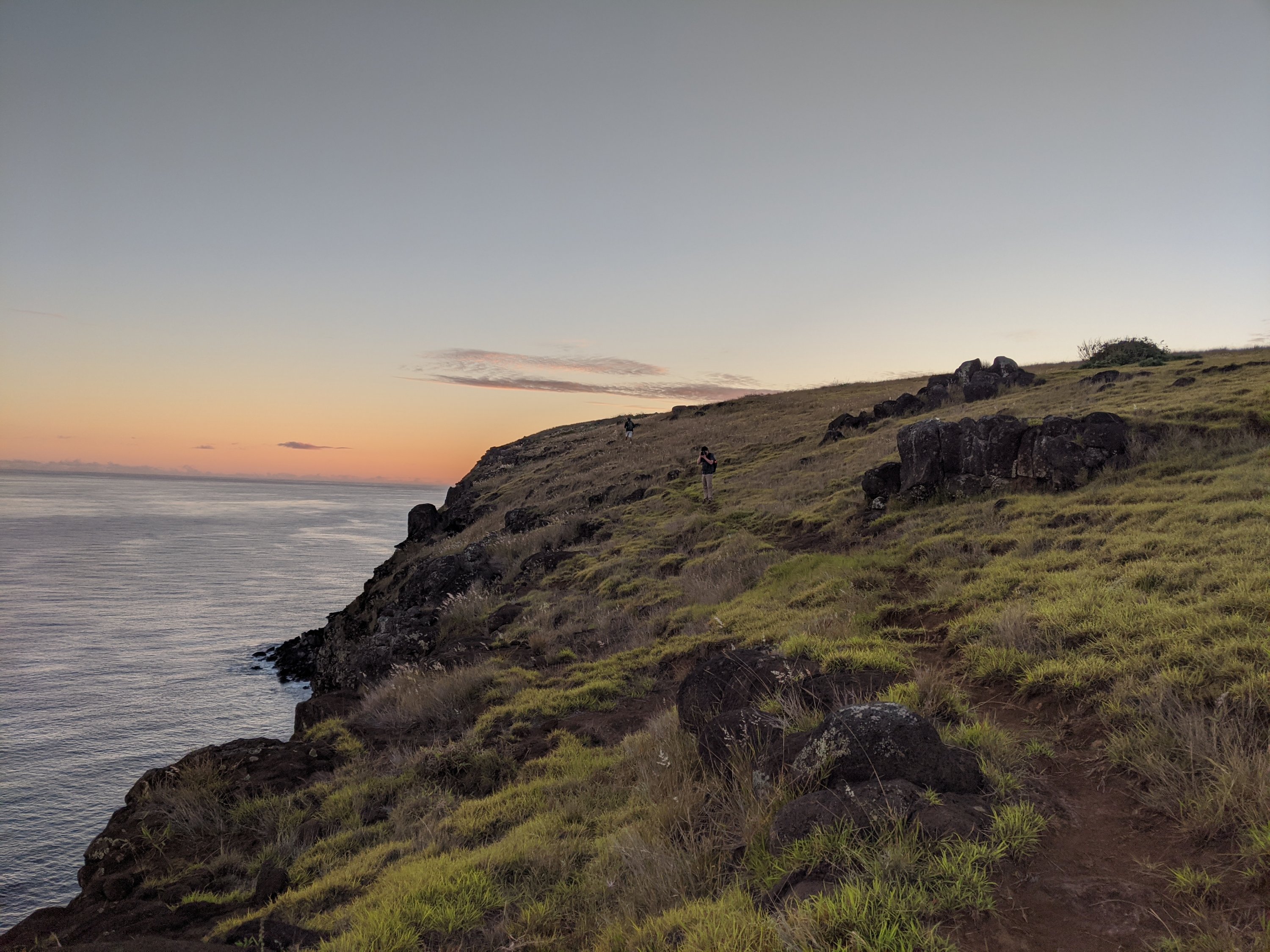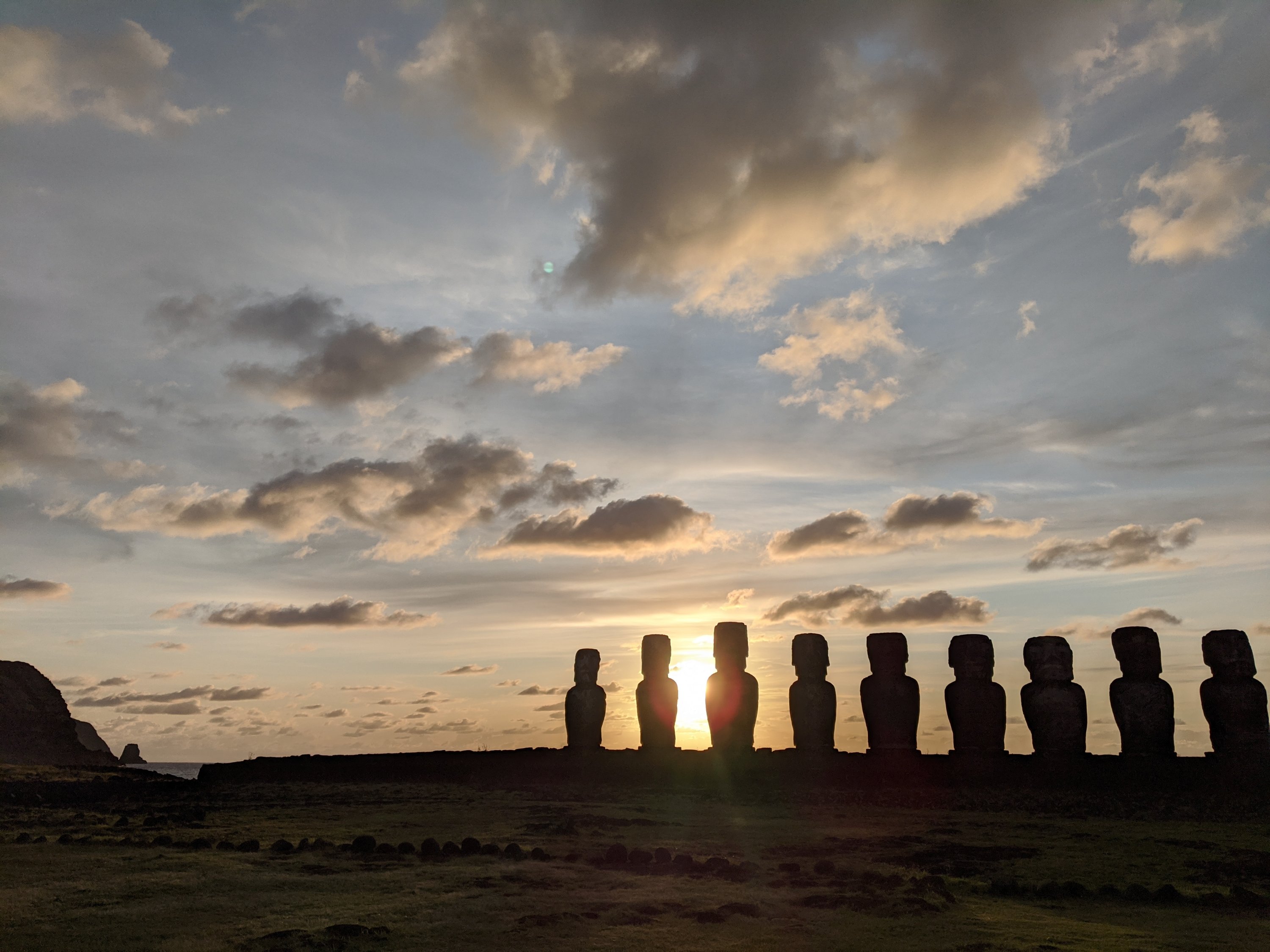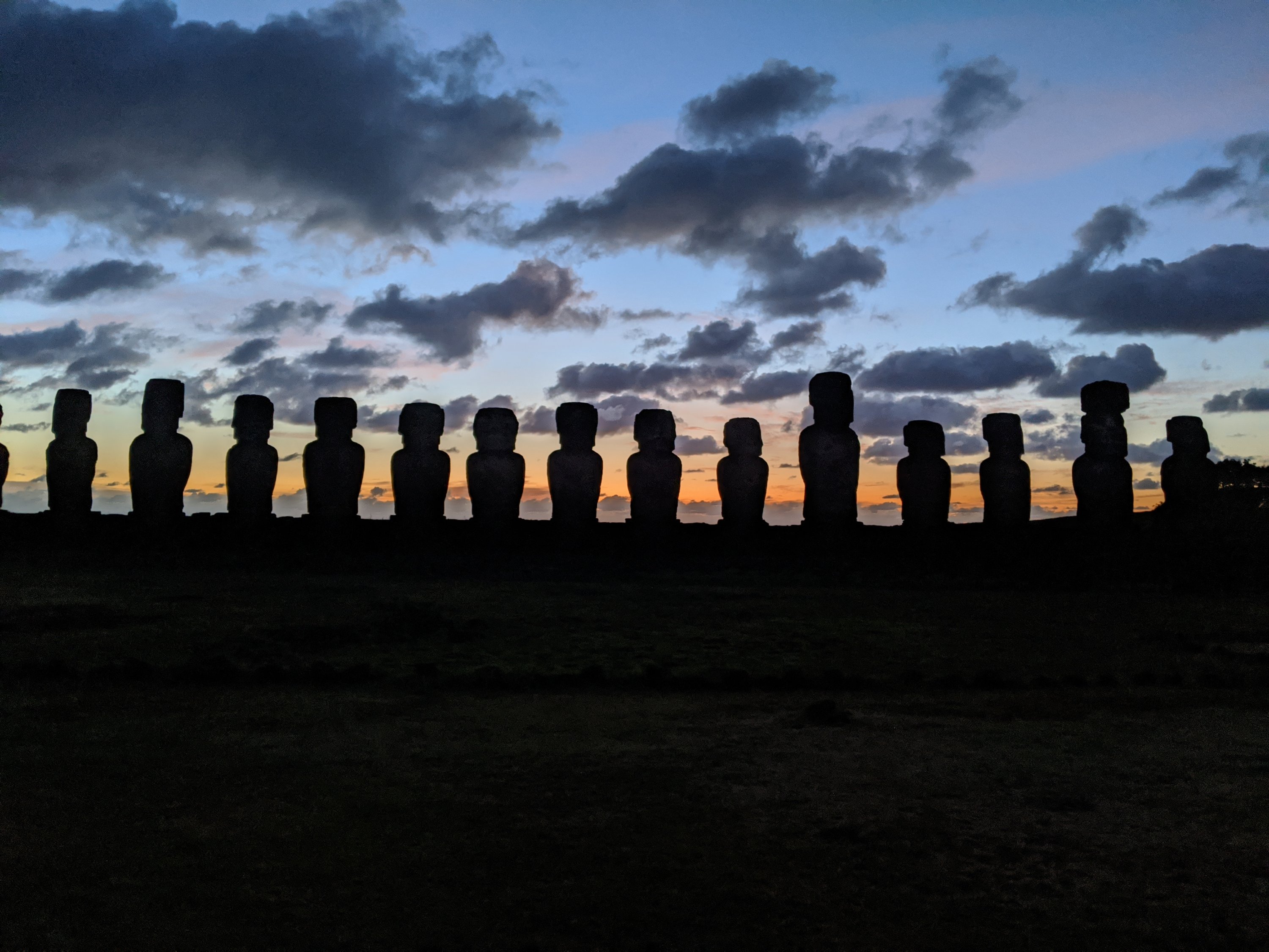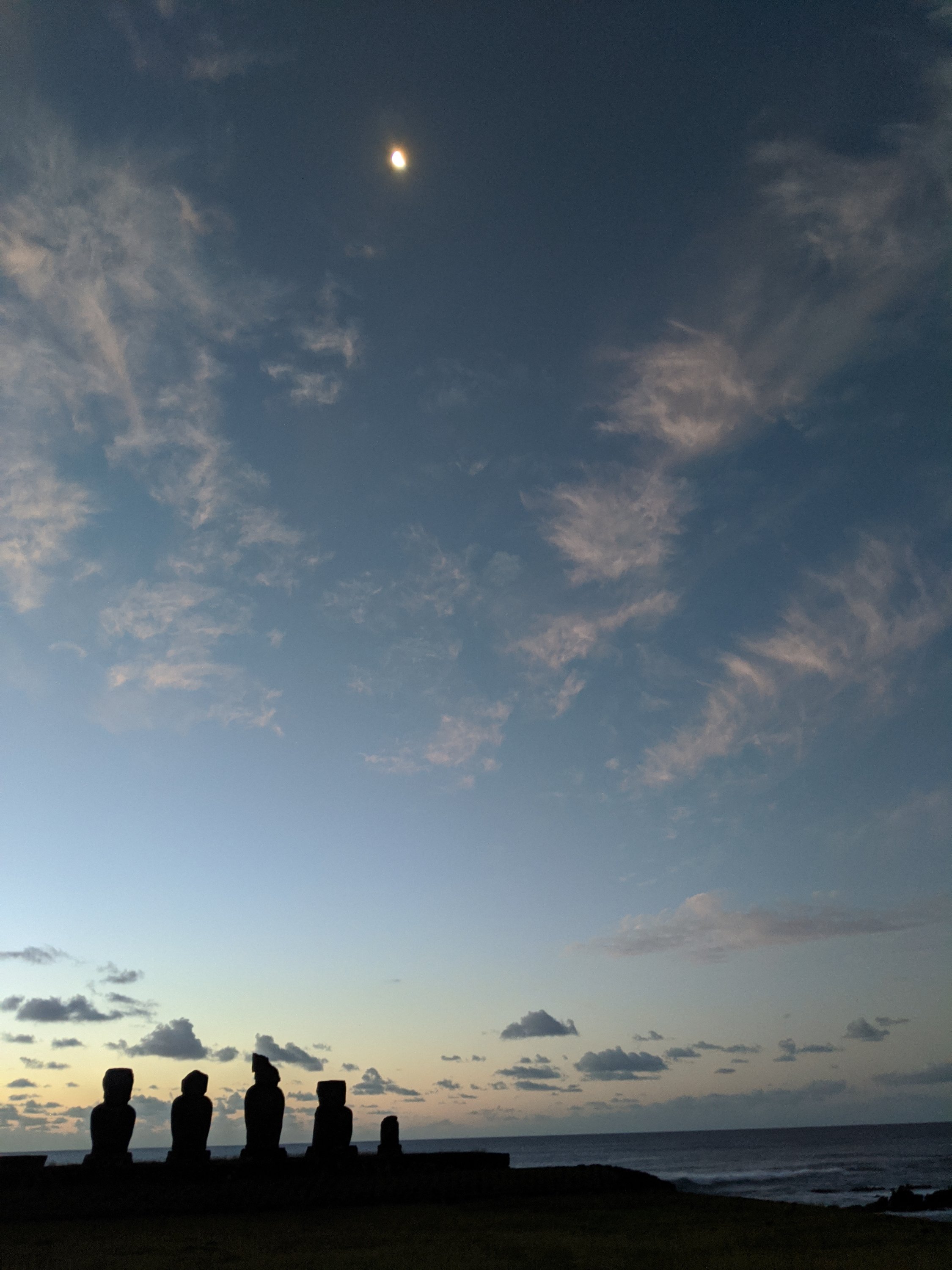 This morning we got up at half past five and took a ride out to Tongariki. It’s the big platform with 15 moai that is on the eastern shore, perfect for sunrise. We got there while it was still dark, found a small hill and waited. And waited. Waited. Finally colors splashed the clouds and we saw the sun lift up between the moai. It was quite pretty. We only ran into two people there that we knew, haha. It’s very odd being in foreign places and knowing people. This island is such a calm and relaxed place. Wild herds of well fed cows and horses roam a landscape dominated by the moai. Chicken are everywhere, constantly pecking and chatting. Super friendly wild dogs run around in packs having a grand time and running up to the humans when they want some love. This brief moment of island life was lovely.
