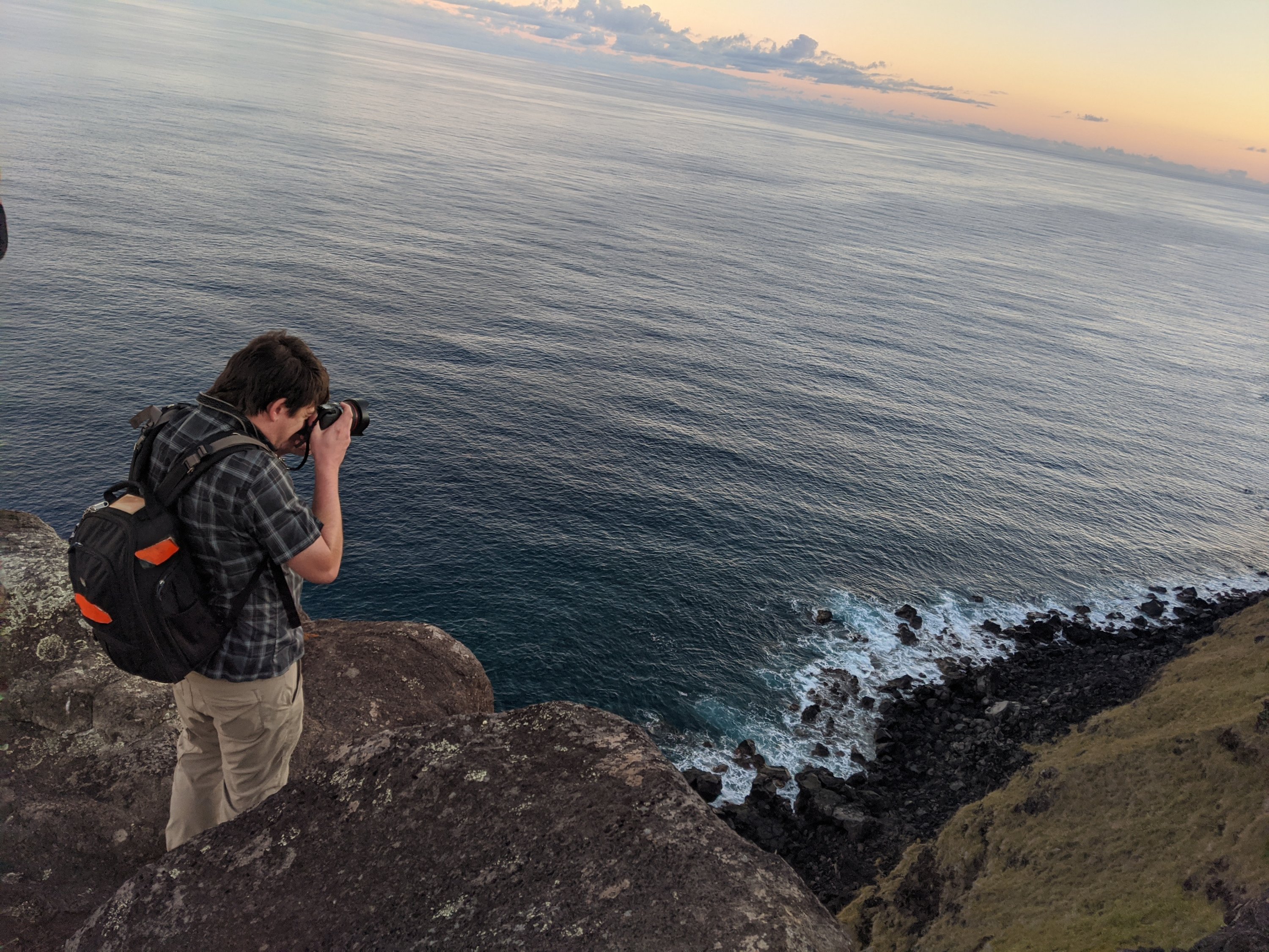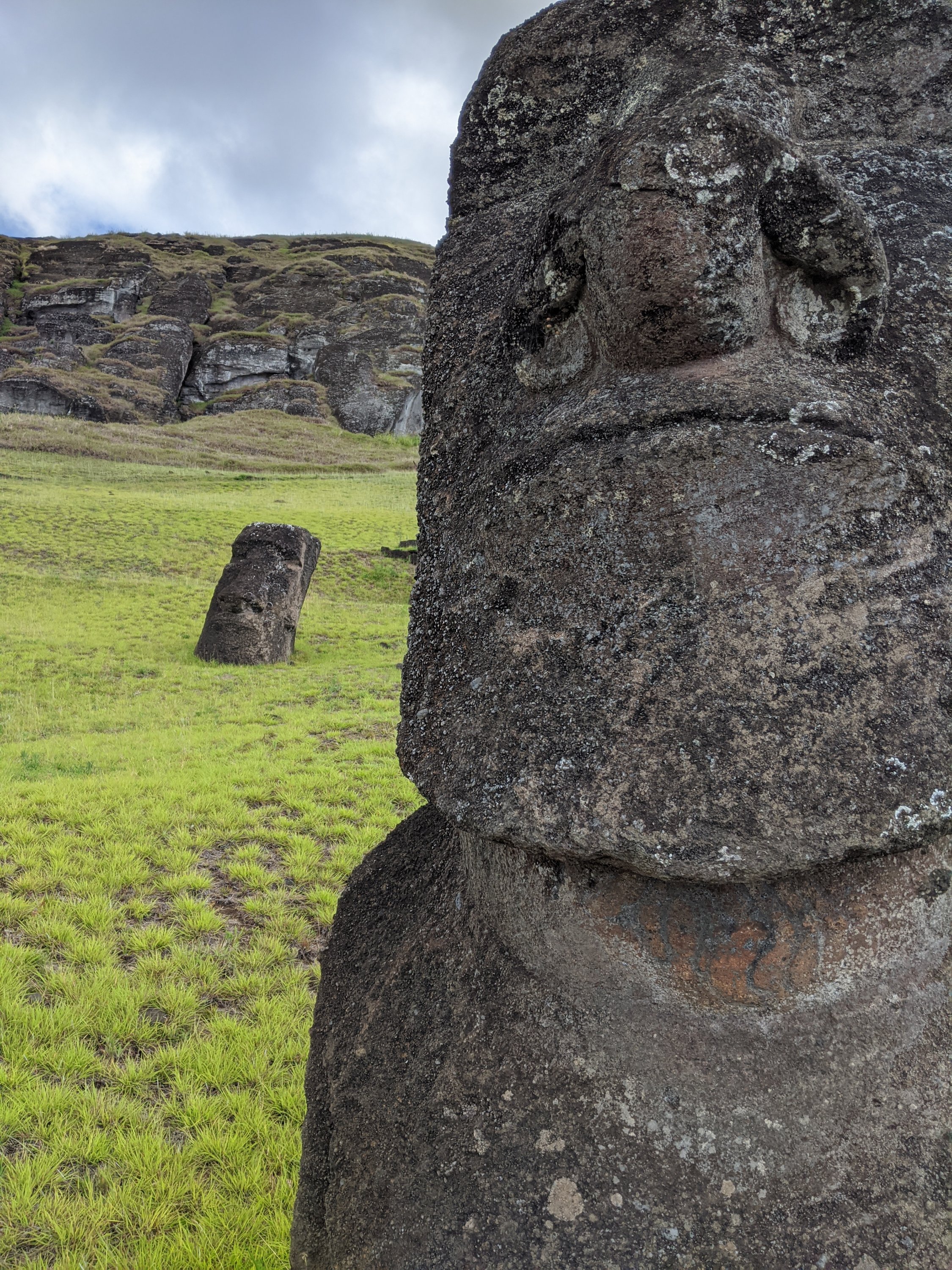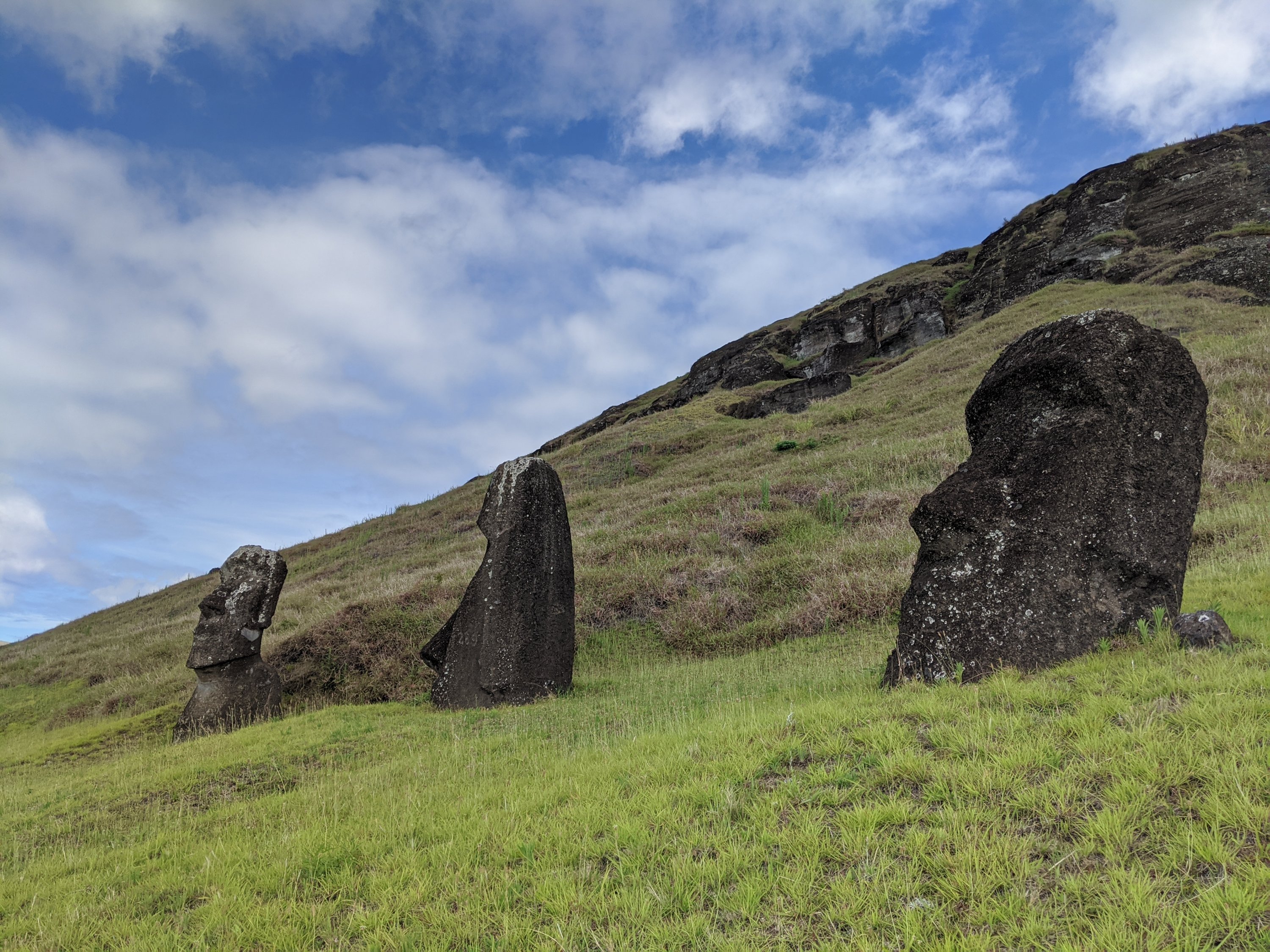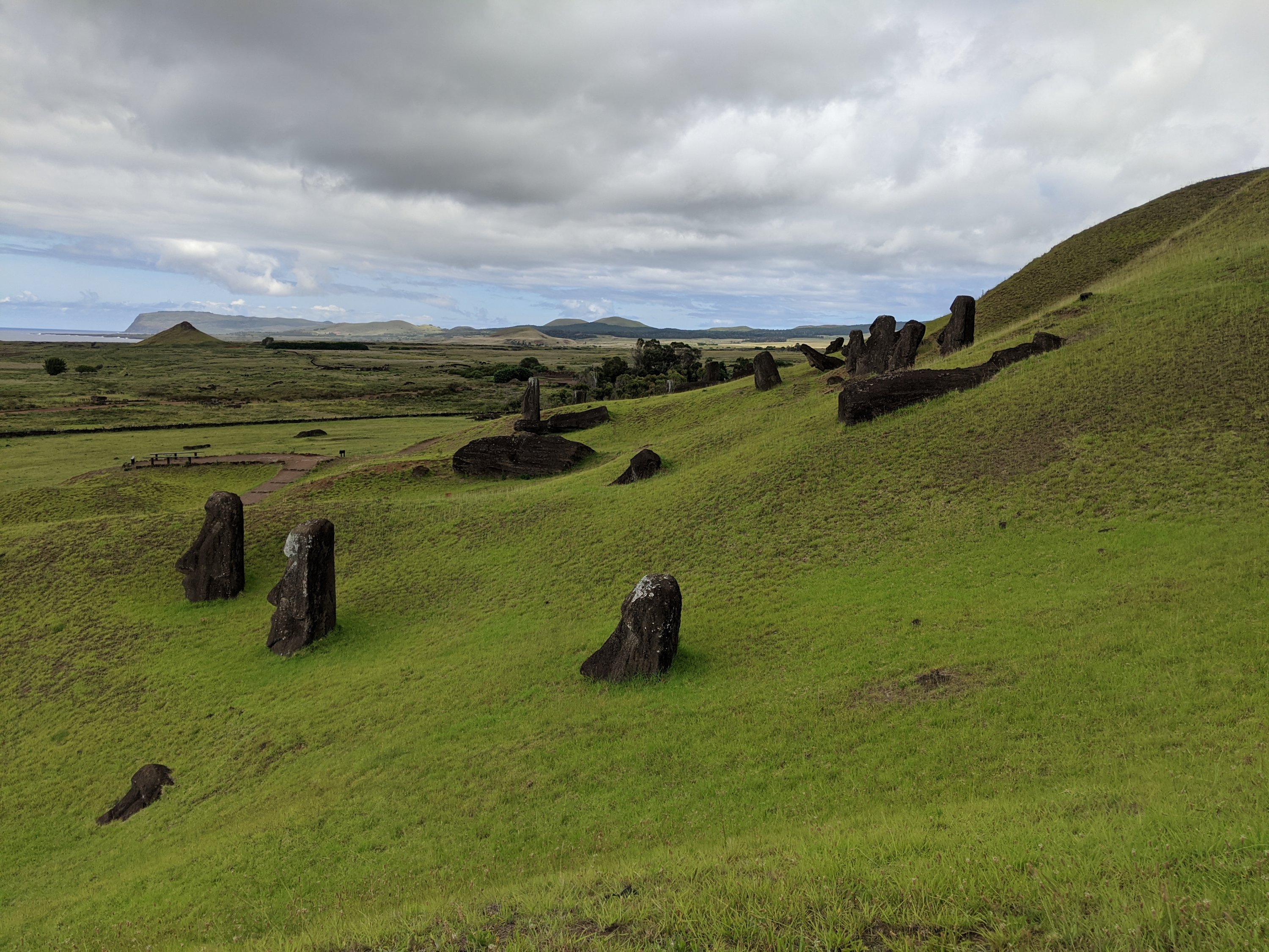 This morning we got up at half past five and took a ride out to Tongariki. It’s the big platform with 15 moai that is on the eastern shore, perfect for sunrise. We got there while it was still dark, found a small hill and waited. And waited. Waited. Finally colors splashed the clouds and we saw the sun lift up between the moai. It was quite pretty. We only ran into two people there that we knew, haha. It’s very odd being in foreign places and knowing people. This island is such a calm and relaxed place. Wild herds of well fed cows and horses roam a landscape dominated by the moai. Chicken are everywhere, constantly pecking and chatting. Super friendly wild dogs run around in packs having a grand time and running up to the humans when they want some love. This brief moment of island life was lovely.