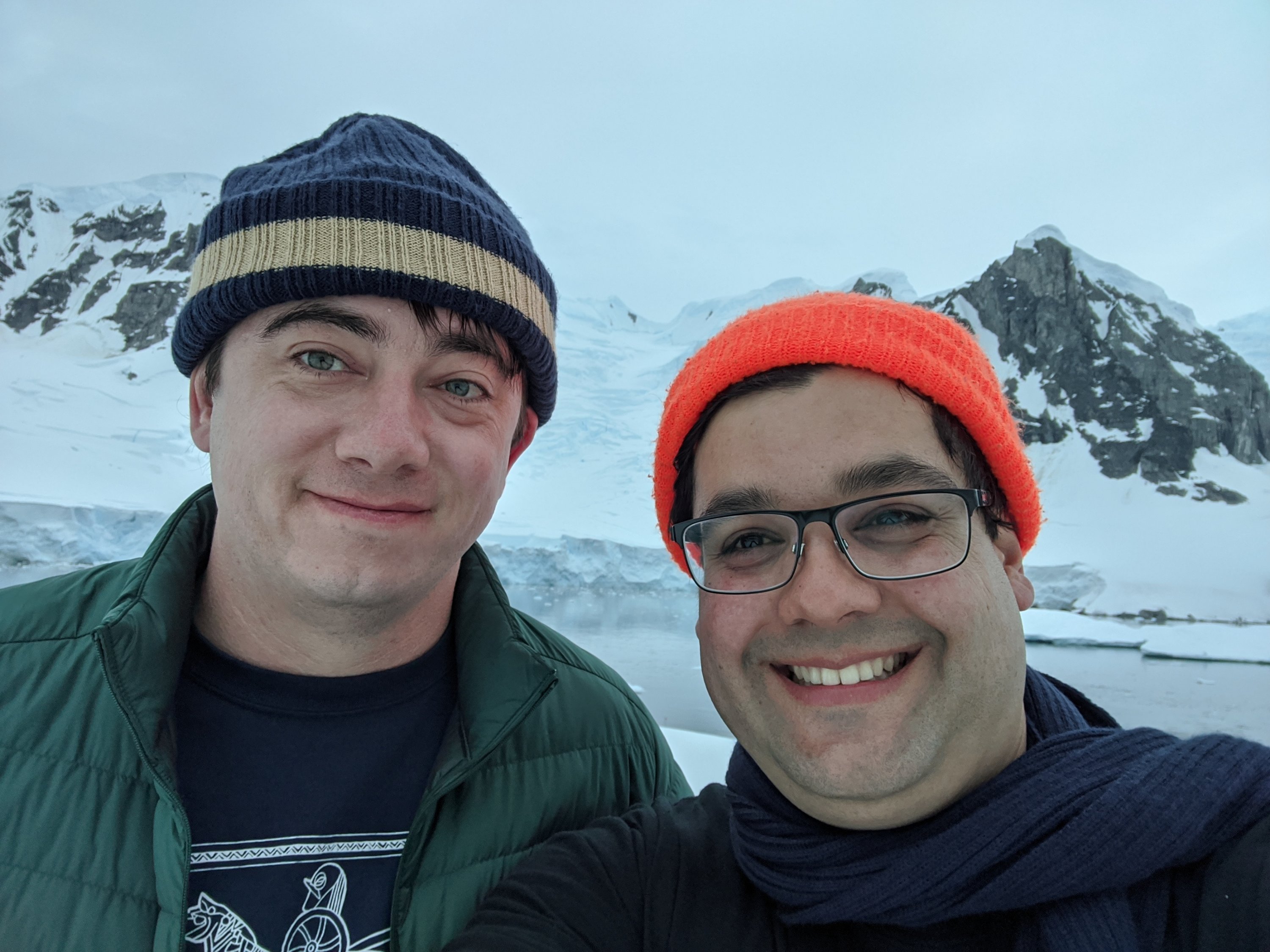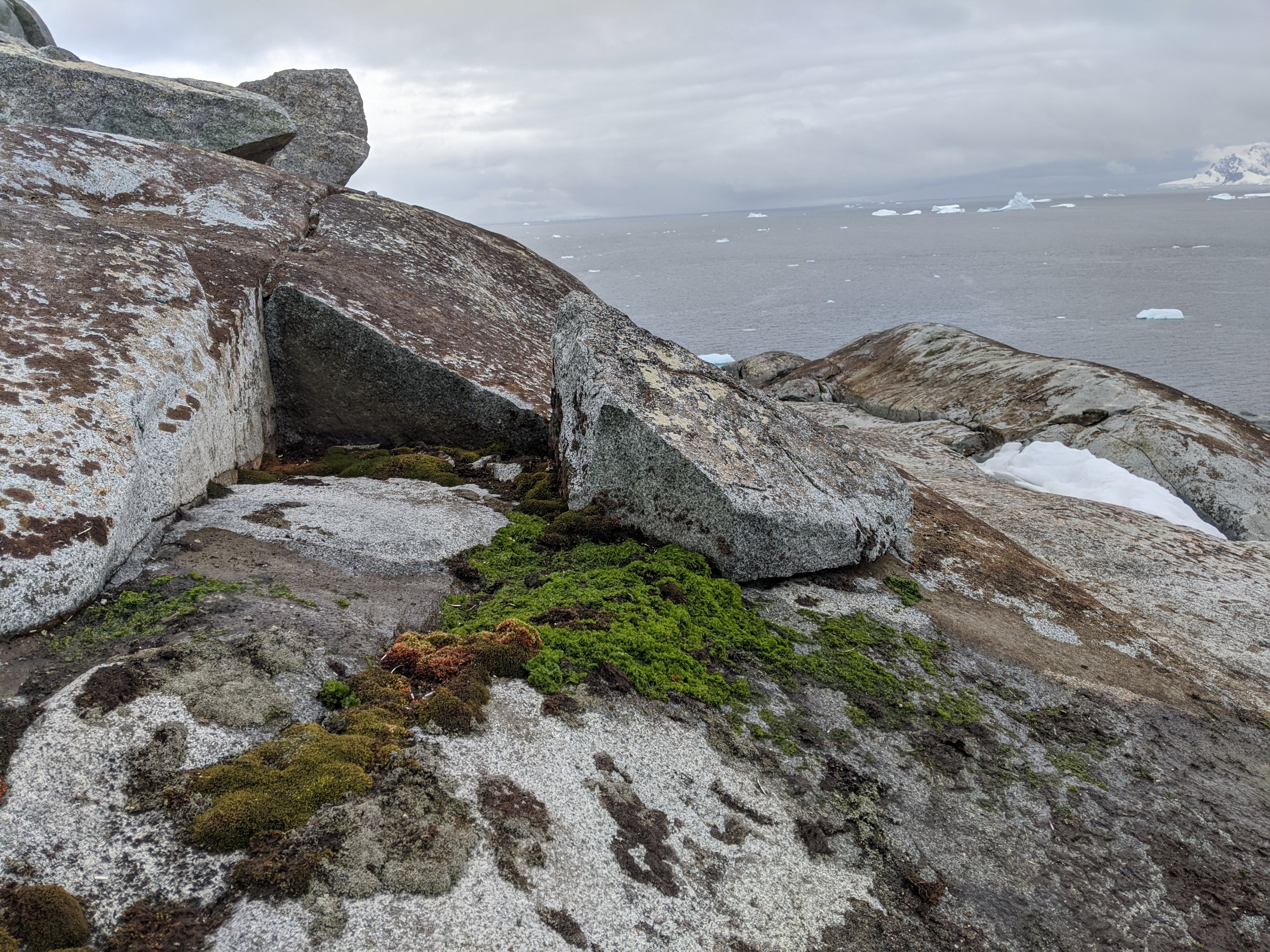 Luckily Santa didn’t pelt us with presents in the night seeing as we had no roof but did leave one on the ship! We woke up to a clear morning and the beautiful views of the sea and glacier. We made our way back to the ship and had a relaxed morning with a delicious breakfast. We then took a Zodiac to Useful Island and hiked up to the top through Chinstrap and Gentoo colonies. At the top we were greeted with a glorious 360 degree view that gave the island its’ name. From there whalers would spot whales to hunt. On the hike up we got my one plant, moss, and I was way too excited about it, not having seen green in awhile. There were also some neon orange lichens which I also loved. After watching penguin antics for awhile we went down to the beach to observe a hauled out seal napping in the snow. After that we took a Zodiac cruise and went to see some amazing icebergs, huge sculptural hunks of ice deceptively small looking because of our lack of scale. It was a cold and windy ride out there and back but we forgot about that when someone spotted a seal in the water. And it had a fish! The seal had a half meter long fish and was thrashing it from side to side on the top of the water. They do this because it’s the only way to break open the fish without hands. The seal kept thrashing, getting more and more fish exposed and gulping it down. The storm petrels arrived, circling the seal and and grabbing bits that fell off. A Skua then came in to try to get some directly from the Seal but was unsuccessful. It was, I don’t know, I’ve run out of superlatives for this trip, amazing/spectacular/wonderful/incredible. I have video and Matt has amazing shots but bad internet will probably keep us from uploading it and all our other amazing stuff till we get home.