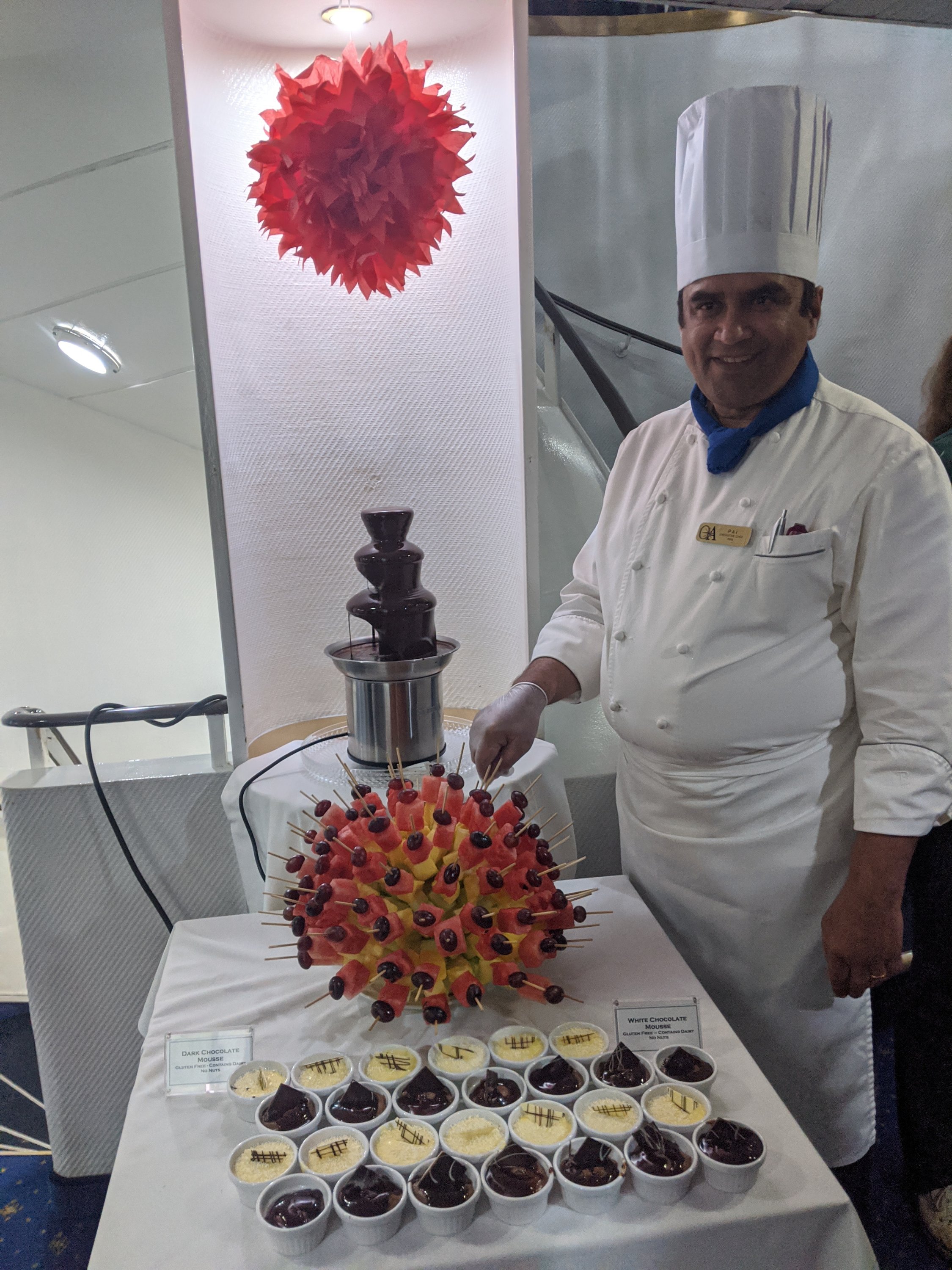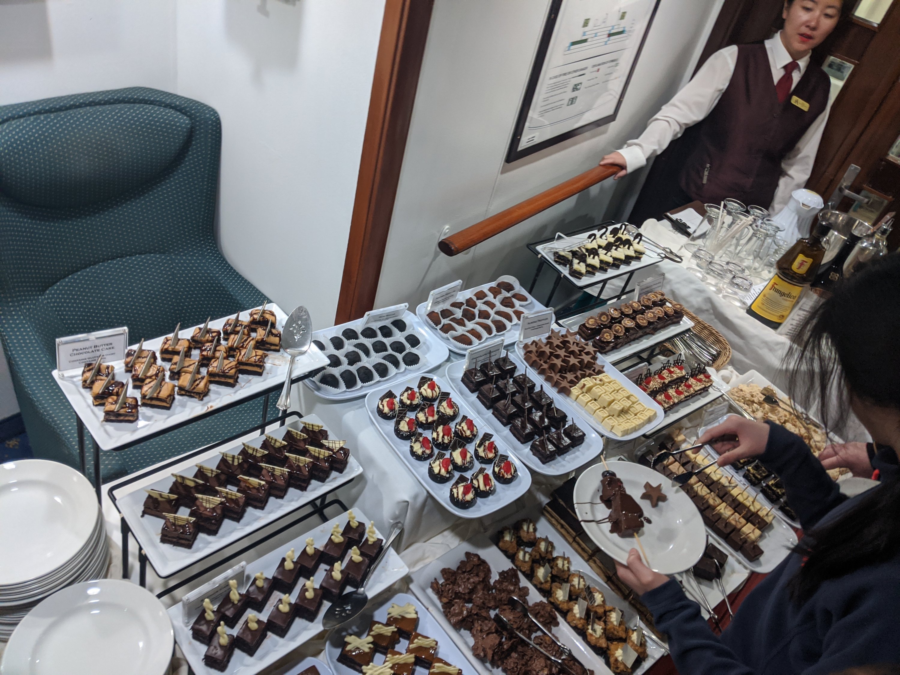 We finished off the day with a fantastic farewell dinner with some of our friends on the ship. The chef went all out with an explosion of chocolate desserts all beautifully made and delicious. I had been trying to meet up with one of the guides, Marla the biologist, all day to show her my pictures of the crab eater seal eating a fish, and finally managed to do so after dessert. She was extremely excited to see them and I gave her copies to use in her presentations. A bunch of the other guides gathered around to check them out as well. It’s great how much they’re all truly into this stuff.